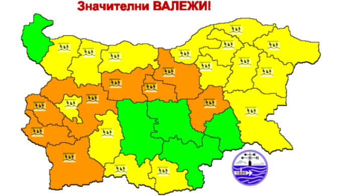 Оранжев код за обилни валежи е обявен за днес за 8 области на страната. Това са областите Кюстендил, Перник, Благоевград, Ловеч, Габрово, Велико Търново, Сливен и София-област.