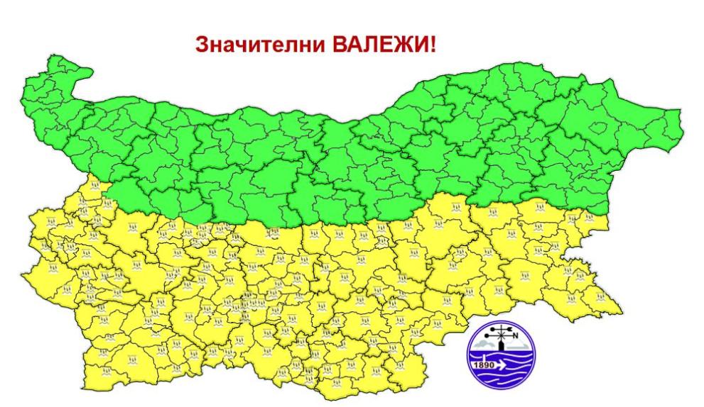 Днес още преди обяд, започналото от северозапад увеличение на облачността ще обхване цялата страна. Ще има валежи, интензивни и значителни на много места в Южна България, където ще са придружени и с гръмотевици, сочи прогнозата на Националния институт по метеорология и хидрология (НИМХ). Синоптиците обявяват жълт код за потенциално опасно време в половин България. Предупреждението е в сила за областите: София град, София област, Перник, Кюстендил, Благоевград, Пазарджик, Пловдив, Смолян, Кърджали, Хасково, Стара Загора, Сливен, Ямбол и Бургас.