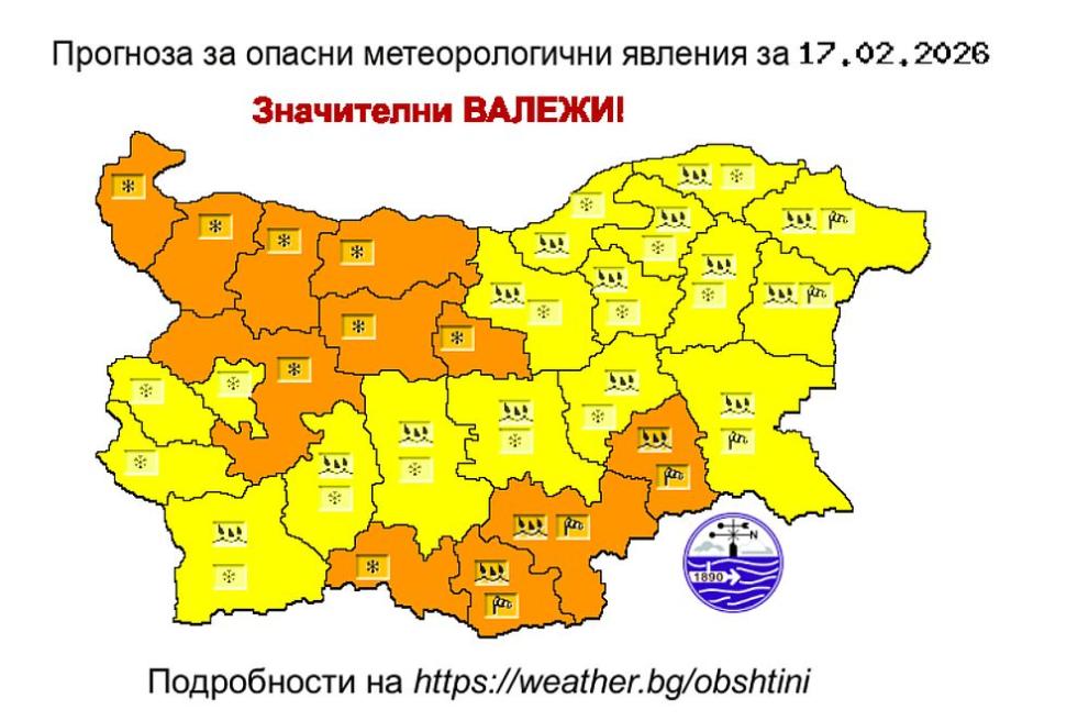 Във вторник под влияние на дълбок средиземноморски циклон ще се създаде валежна обстановка. Синоптиците обявяват оранжев код за опасно време и жълт код за потенциално опасно време в цяла България. Това сочи прогнозата на Националния институт по метеорология и хидрология (НИМХ).