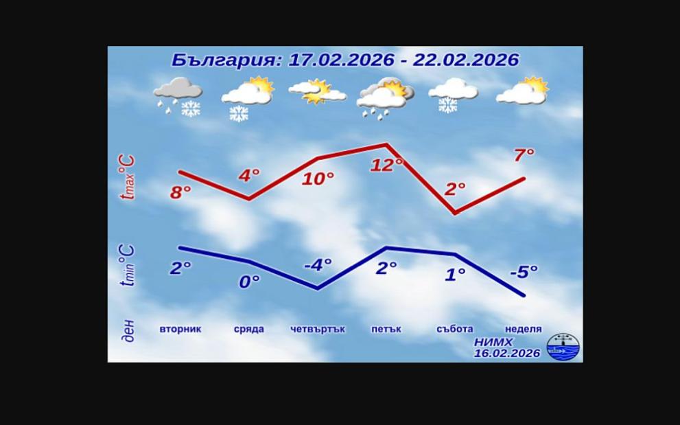 Ще е облачно с повсеместни, на места значителни валежи. В Северна и Западна България ще вали сняг и ще се образува снежна покривка, а в Горнотракийската низина и по Черноморието ще вали дъжд, който със застудяването вечерта ще преминава в сняг. Ще духа умерен и временно силен северозападен, в източната половина от страната – североизточен вятър и с него ще нахлува студен въздух. Температурите ще се понижат значително и ще са почти без денонощен ход – между 0° и 5°.