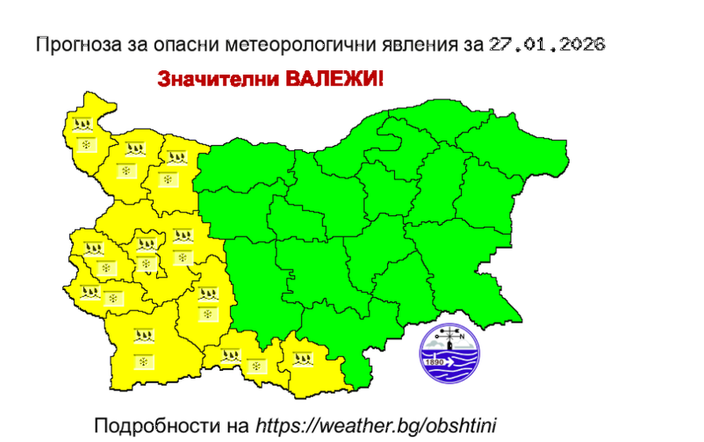 Предупреждението е в сила за областите Видин, Монтана, Враца, София-област, София-град, Перник, Кюстендил, Благоевград, Пазарджик, Смолян и Кърджали.