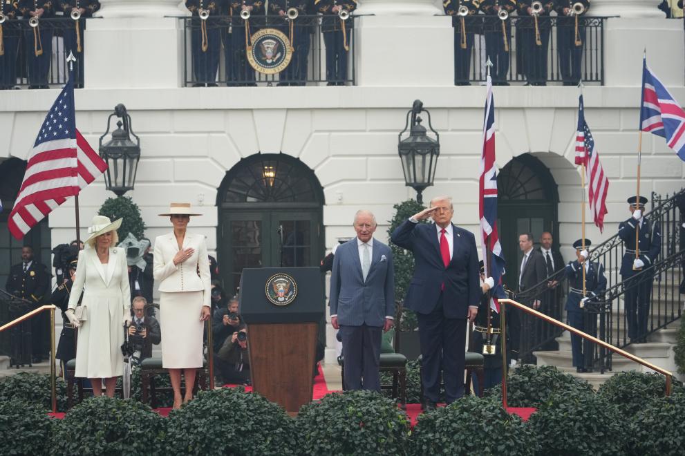 Чарлз и кралица Камила бяха посрещнати от президента и първата дама Мелания Тръмп за сутрешно посещение в президентската резиденция, след което кралят трябва да произнесе обръщение към Конгреса.
