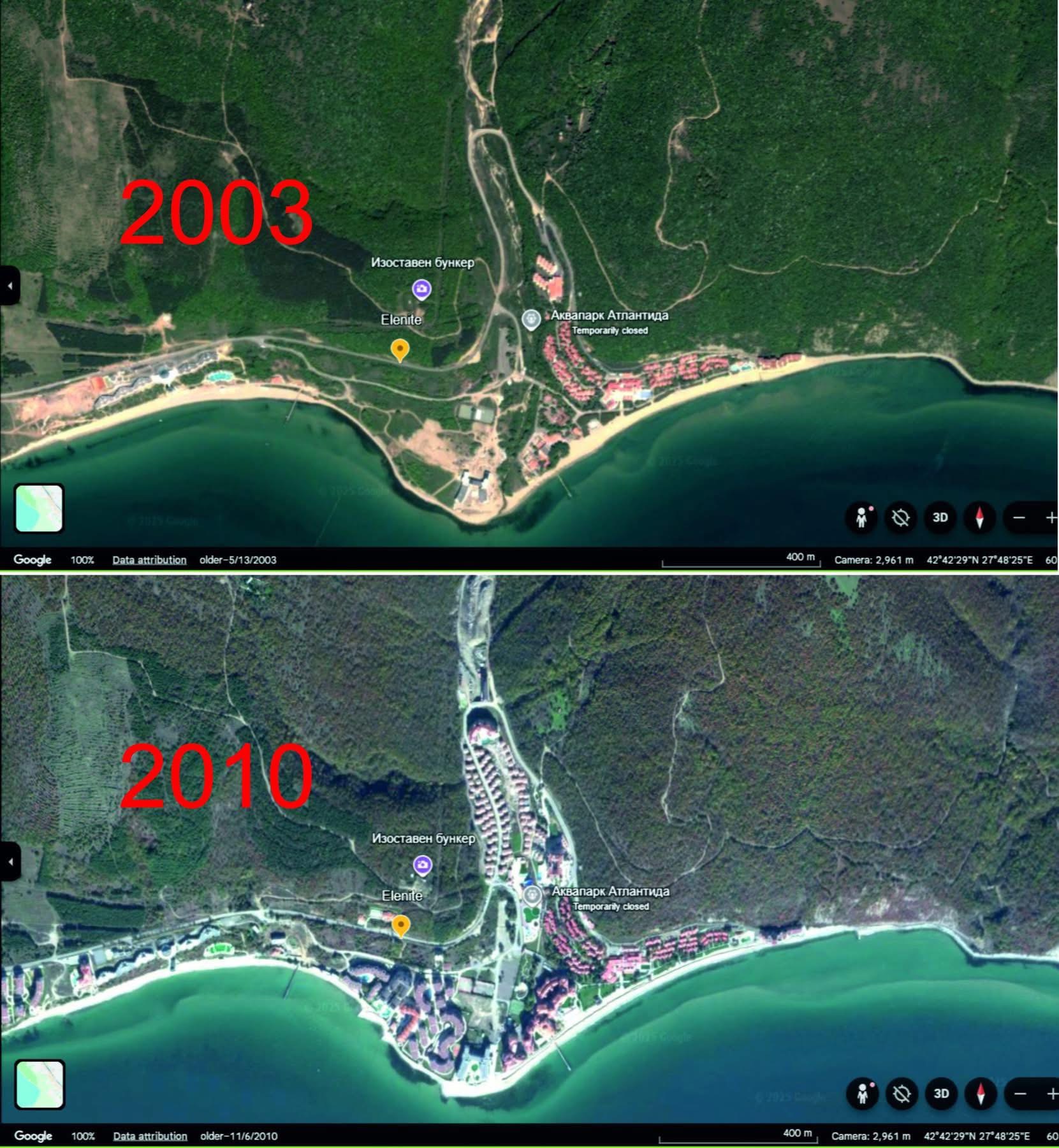 Към поста си Нанков прибавя две снимки на ваканционното селище – от 2003 г. и от 2010 г., от които става ясно кога е извършено застрояването на дерето.