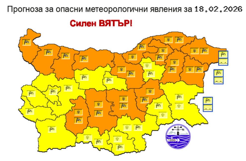 Силен северозападен вятър и виелици обхващат страната. За днес е обявен оранжев код за опасно време в голяма част от Северна и Централна България и жълт код за потенциално опасно време в останалите райони. Очакват се навявания в Дунавската равнина, поледици в Североизточна България и ураганни пориви в планините. На места в североизточните райони ще се образуват поледици. Това сочи прогнозата на Националния институт по метеорология и хирдрология (НИМХ).