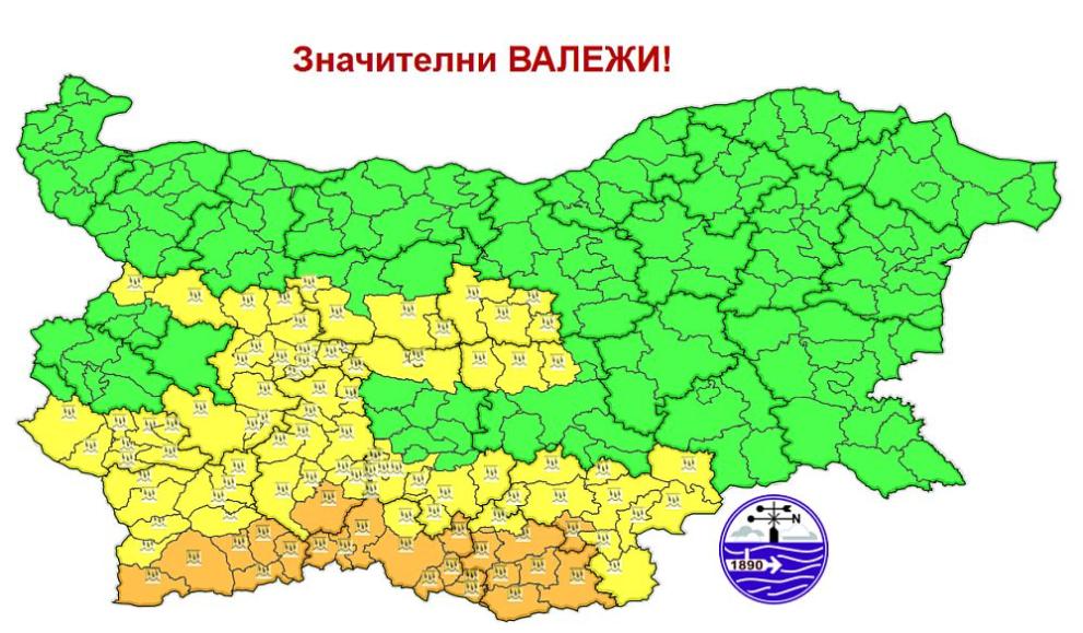 През нощта обаче облачността над цялата страна ще се увеличи и на места в Западна България ще превали слаб дъжд. В Дунавската равнина и Горнотракийската низина ще бъде почти тихо, в Източна България и на север от планините с умерен югозападен вятър. Минималните температури ще бъдат предимно между 0° и 5°, в югоизточните райони до 7°-8°, в София – около 2°. Утре (29 януари, четвъртък) времето в страната ще е под влияние на средиземноморски циклон. Ще бъде предимно облачно, на места в равнините и мъгливо. След временно отслабване и спиране на валежите, още преди обяд от юг отново ще се активизират и до вечерта ще обхванат почти цялата страна. Значителни количества на валежите ще има в Южна България. В югоизточните райони са възможни и гръмотевици. Синоптиците обявяват оранжев и жълт код за значителни валежи в част от страната. Оранжев код за опасно време е в сила за областите Бургас, Ямбол, Хасково ,Кърджали, Смолян и част от Благоевград. Жълт код за потенциално опасно време е в сила за Варна, Шумен, Сливен, Стара Загора, Пловдив, Пазарджик, София област и Кюстендил.