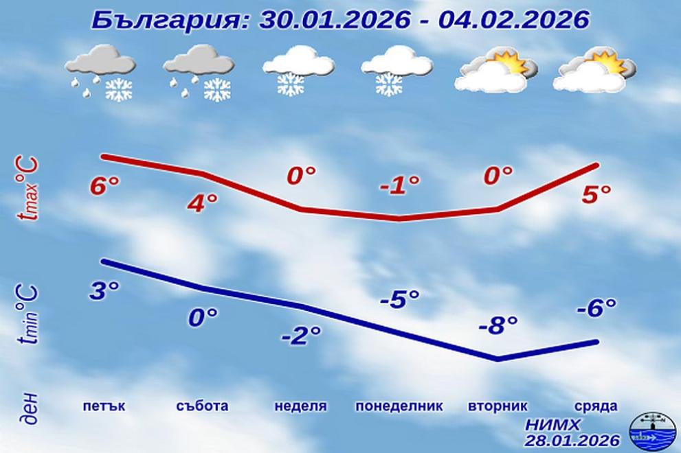 В петък (30 януари) ще преобладава облачно време. На много места ще има валежи от дъжд, значителни на места в югоизточната половина от страната. С умерен, в Източна България и временно силен северозападен, по-късно през деня – североизточен вятър ще нахлува студен въздух, температурите ще се понижават и до вечерта на места в Северна България дъждът ще премине в сняг. Минималните температури ще бъдат между 0° до 5°, максималните – между 3° до 8°, на места в Източна България до 10°-12°. След временно спиране на валежите, в събота от югозапад те отново ще се активизират. В Южна България и по Черноморието ще завали дъжд, а в Северна България и по високите полета – сняг. От североизток с умерен, в Източна България и временно силен вятър ще нахлува студен въздух и температурите ще се понижават.