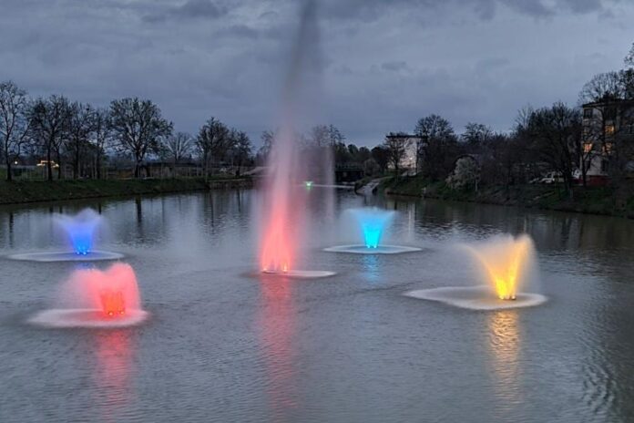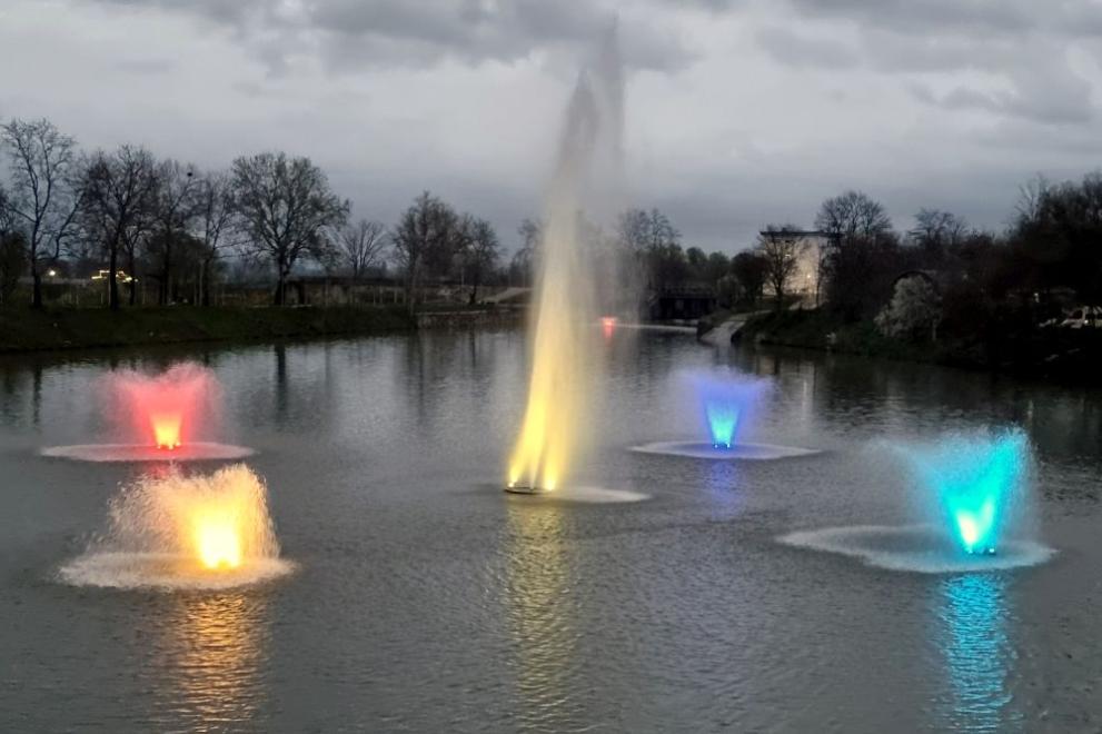 Подобни фонтани са монтирани на няколко места в речния ръкав, преминаващ през градския парк.