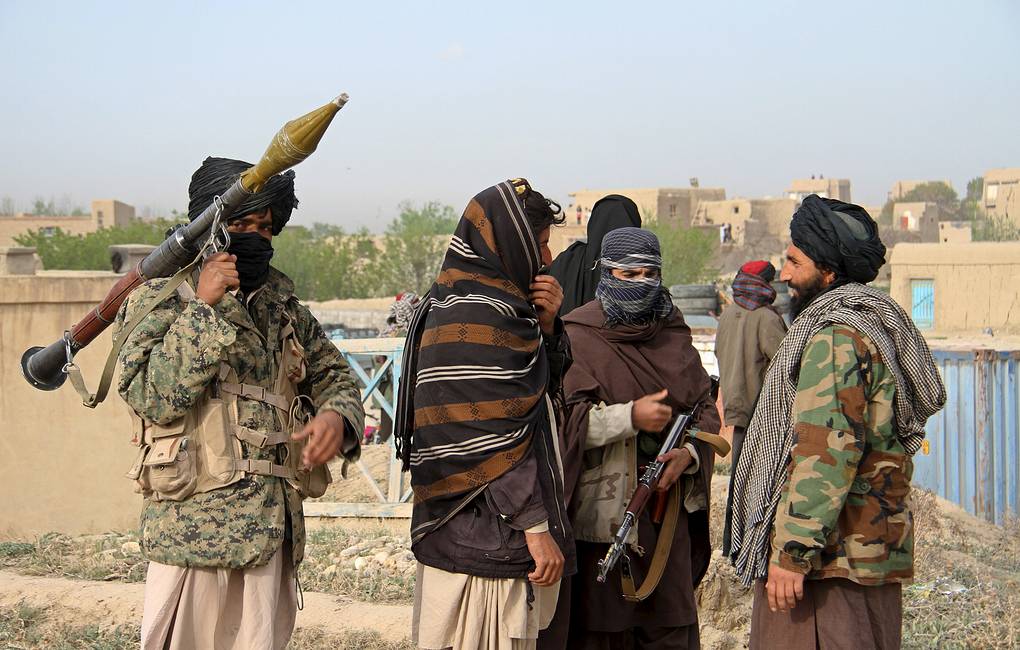 Members of the Taliban gather at the site of the execution of three men accused of murdering a couple during a robbery in Ghazni Province
